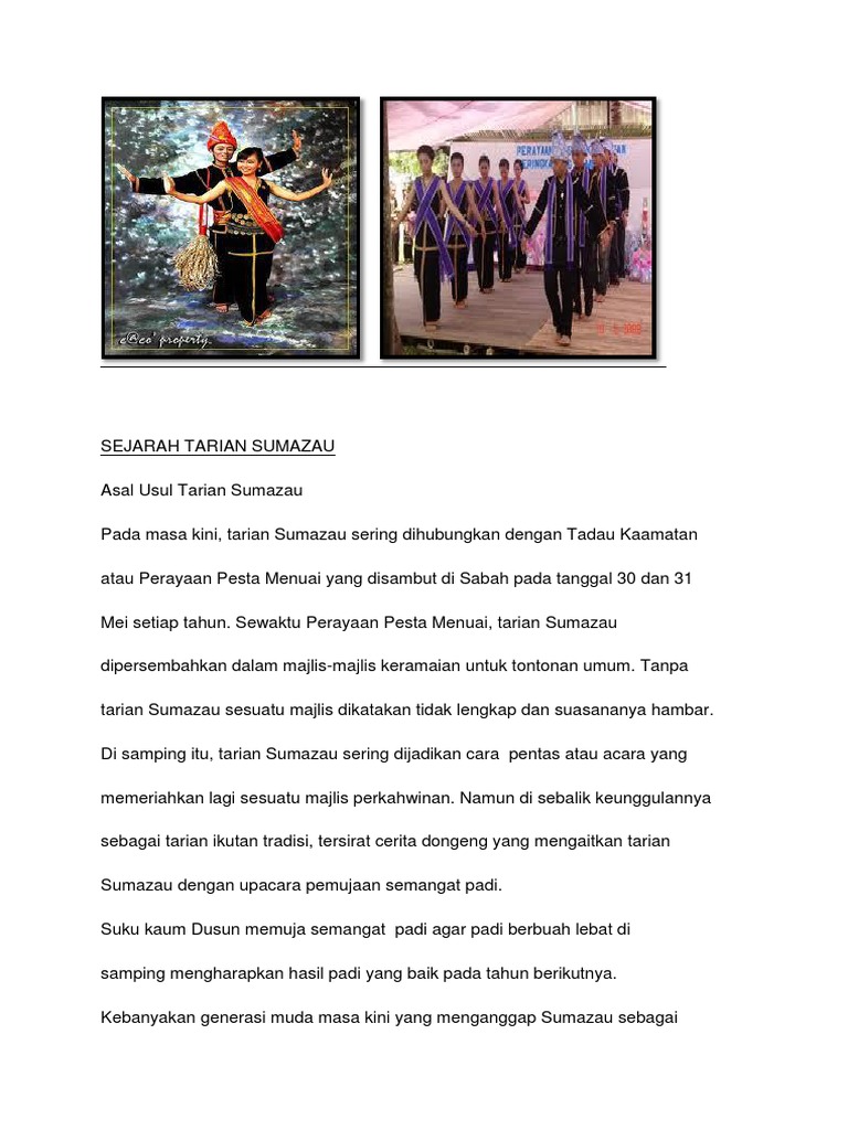 Asas tarian sumazauasas tarian sumazau. Timpan, masak udang cumi, gulai aceh,daging masak pedas, korma kambing, sie reubeouh cuka, gulai kepala ikan, meuseukat, kanji rumbi,dll.tarian tradisional : Tarian sumazau merupakan sejenis tarian tradisi rakyat sabah yang amat terkenal di sabah dan di seluruh malaysia. Diiringi oleh ensembel yang dikenali sebagai sompogogungan. Sudah sejak lama, mulai zaman dahulu hingga zaman modern sekarang ini musik menjadi pelengkap hidup manusia.