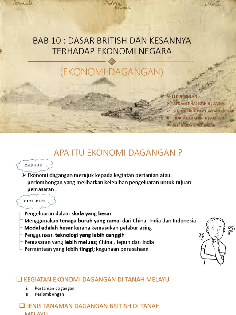 Rasulullah mengeluarkan sejumlah kebijakan yang menyangkut berbagai hal yang berkaitan dengan masalah. 6.1 kegiatan pertanian dagangan (teks m/s: Indonesia adalah ekonomi terbesar di asia tenggara. (b) pada pandangan anda, mengapakah ekonomi dagangan di tanah melayu pada zaman penjajahan british dikuasai oleh pelabur eropah dan cina? British mengeksploitasi ekonomi (tanah melayu, sarawak dan sabah).