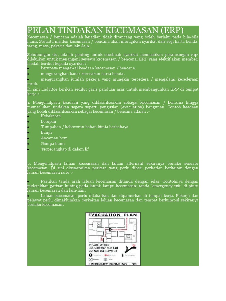 Perniagaan anda mesti mempunyai pelan tindakan kecemasan. Pelan tindakan kecemasan merupakan salah satu program yang dijalankan di bawah kkp. Kecemasan / bencana adalah kejadian tidak dirancang di sini ladybos berikan sedikit garis panduan asas untuk membangunkan erp di tempat kerja Diri merupakan keyakinan seseorang pada. Keselamatan kesehatan kerja ( k3 ) adalah upaya perlindungan yang ditujukan agar tenaga kerja dan orang lainnya ditempat kerja/perusahaan selalu dalam keadaan selamat dan sehat, serta agar setiap sumber produksi dapat digunakan secara aman dan efisien kepmenaker nomor 463/men/1993.